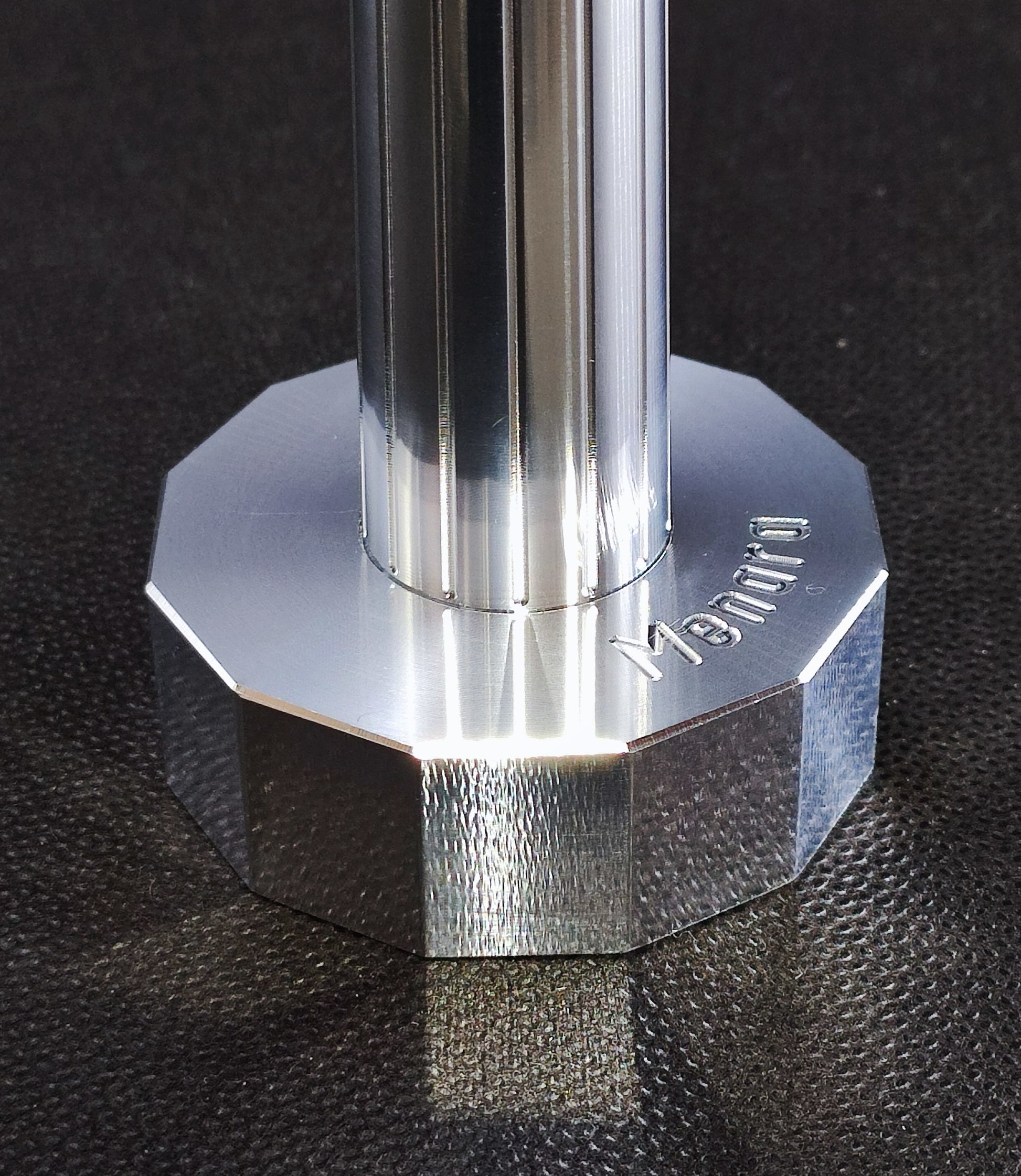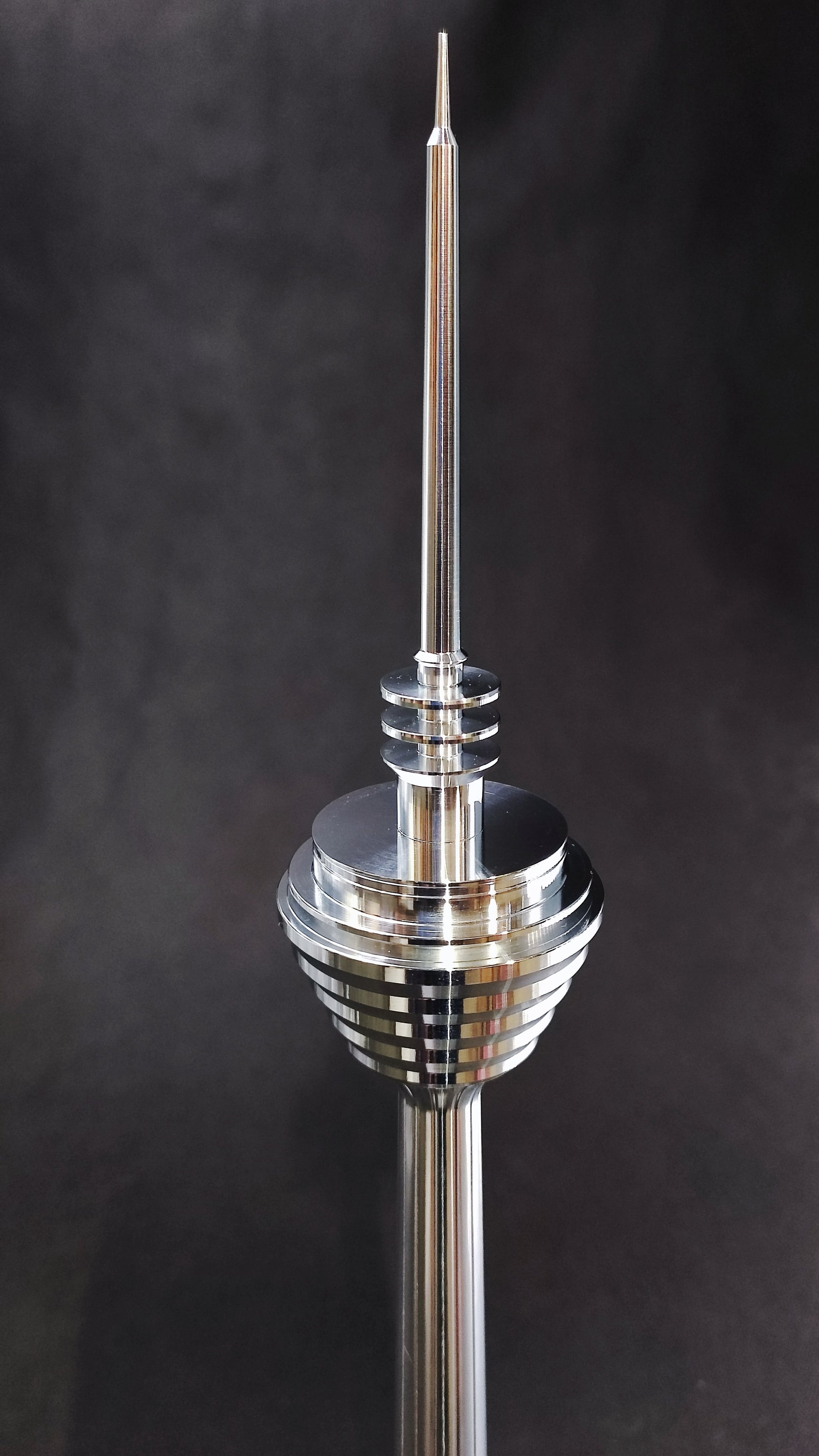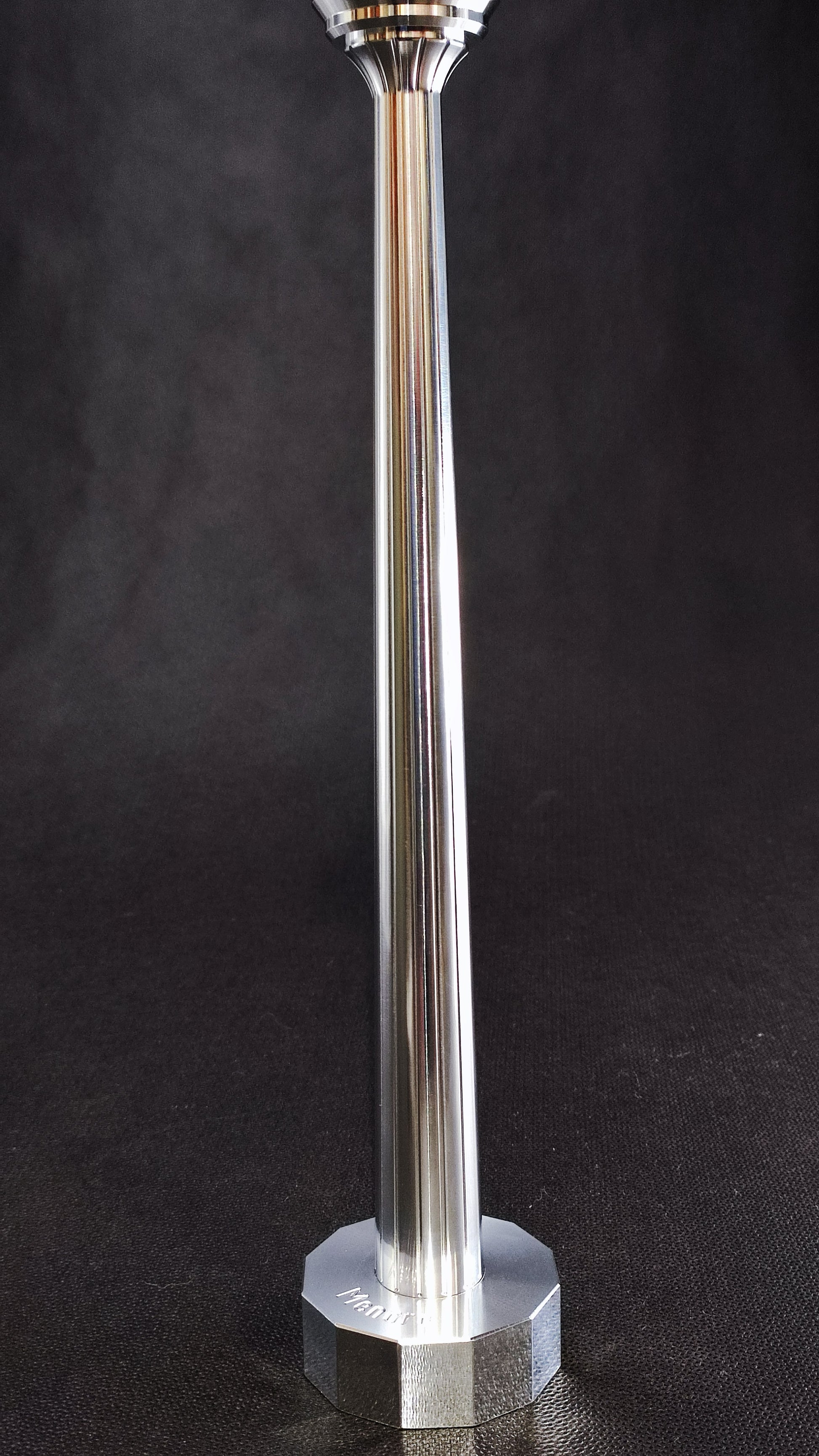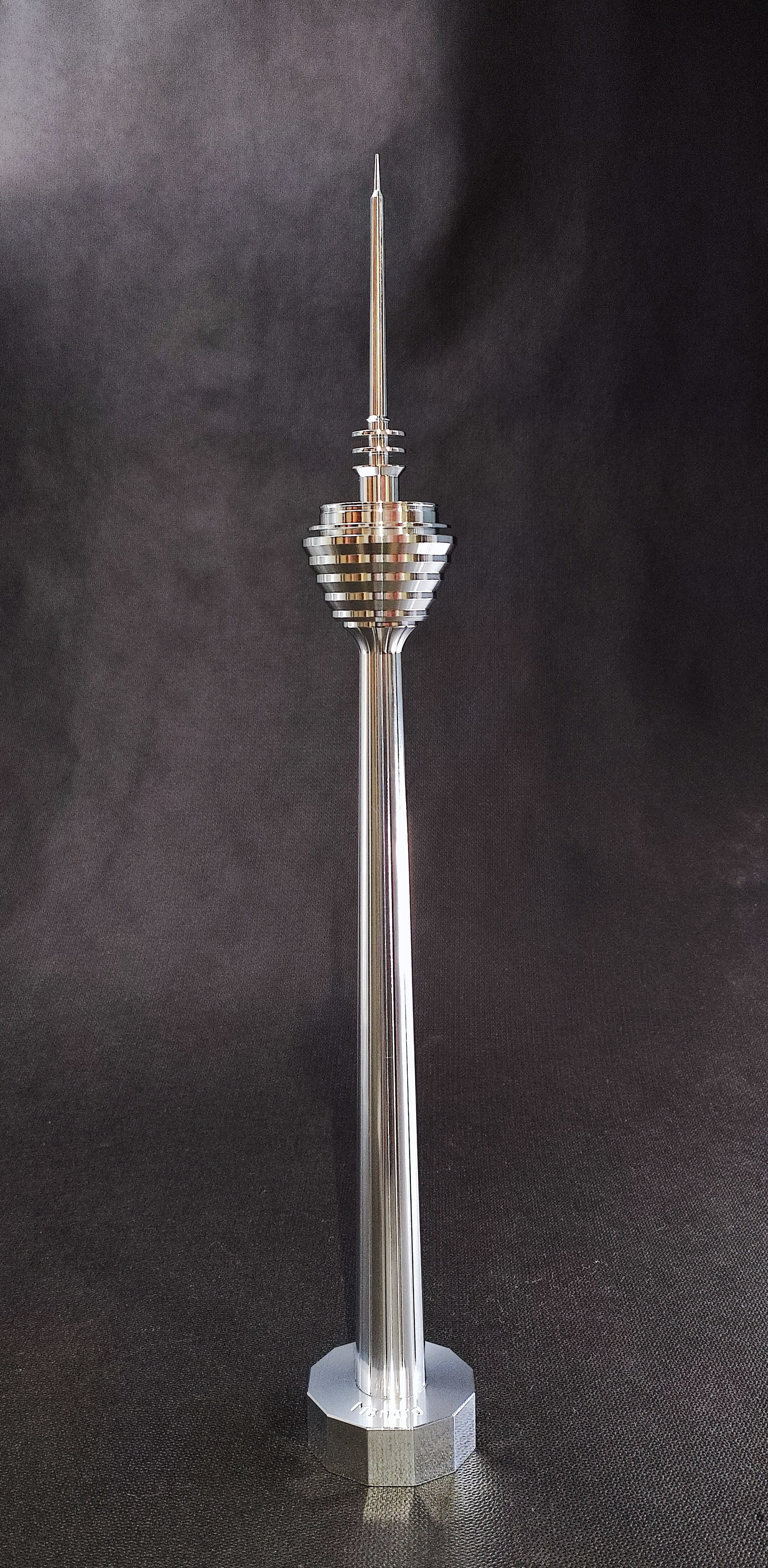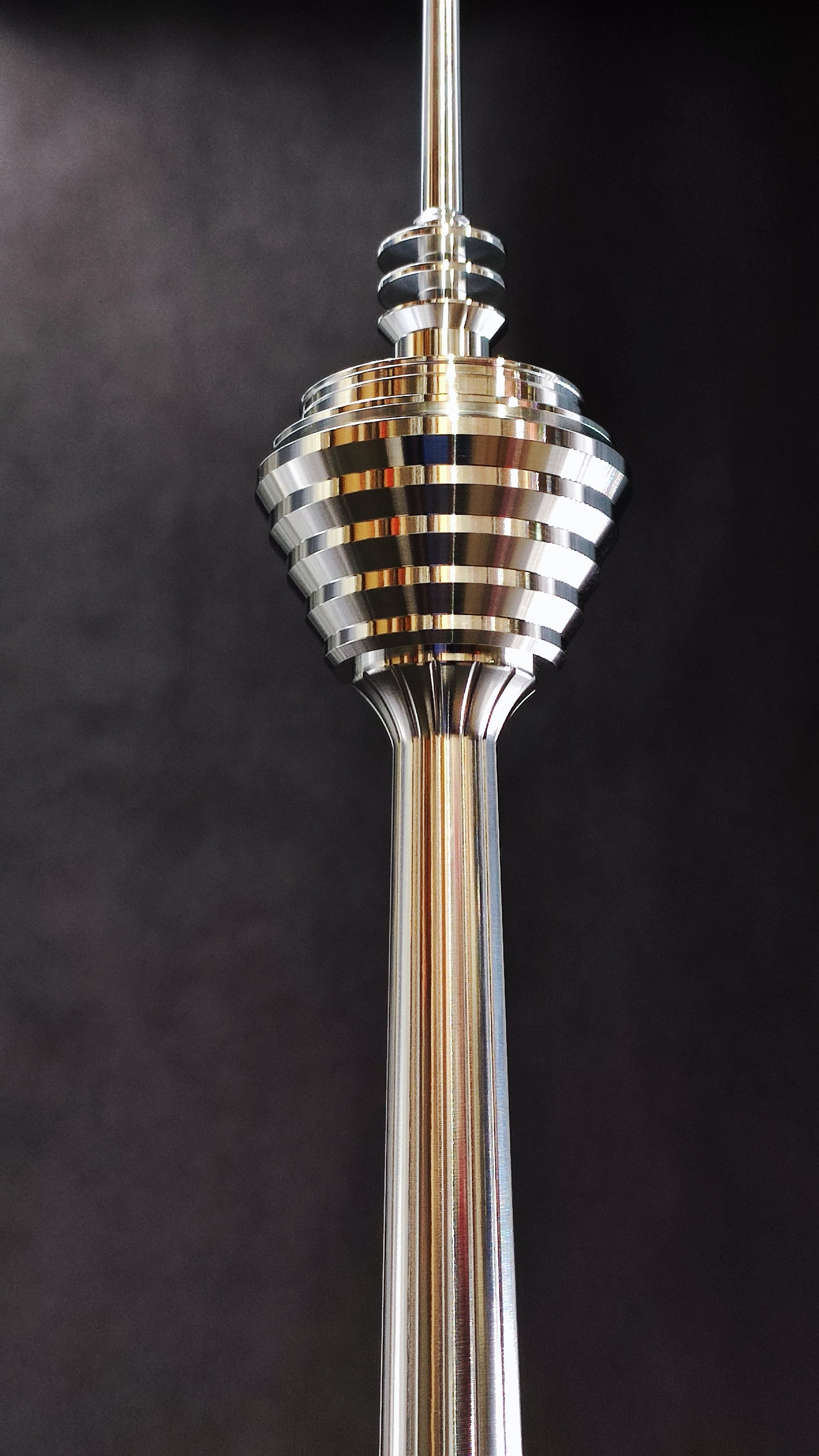 Der Turm besteht aus fünf Teilen, die einfach zusammengeschraubt werden. Der Sockel ist standardmäßig mit dem Schriftzug "Menara" graviert, kann aber auch gerne personalisiert werden.