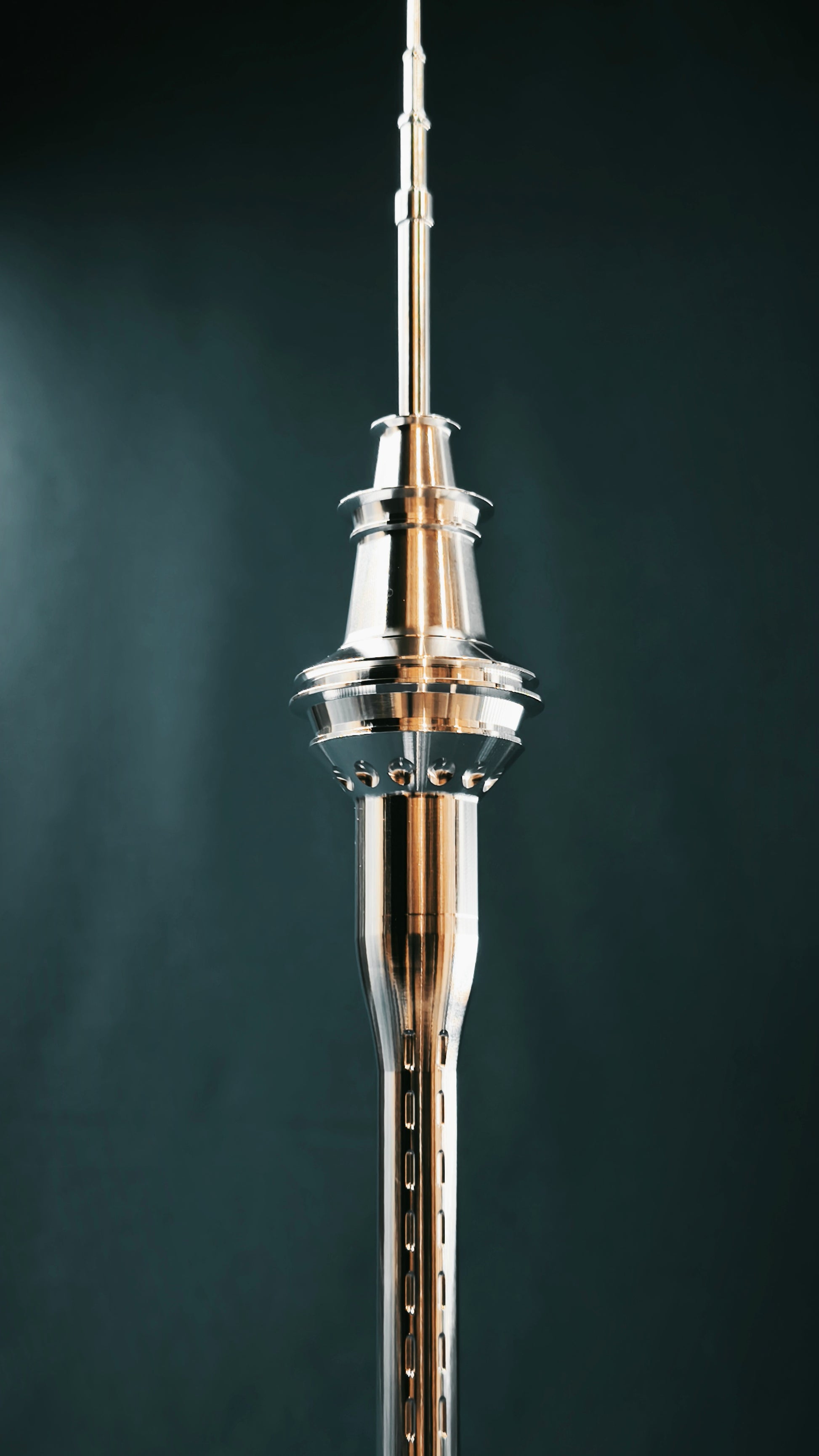 Der Turm besteht aus zwei Teilen, die einfach zusammengeschraubt werden. Der Sockel ist mit dabei. Geliefert wird das Modell in einer schönen Holzkiste mit einer kurzen Beschreibung des Originals.